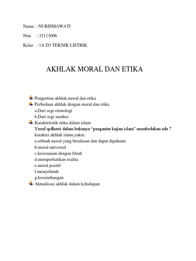 Moral adalah pengetahuan seseorang terhadap hal baik atau buruk, sedangkan karakter adalah tabiat seseorang yang langsung ditentukan oleh otak. Dalam dictionary of education dikatakan bahwa : Sementara perbedaan diantara ketiga istilah tersebut ialah; Akhlak secara etimologis, kata akhlak berasal dari bahasa arab ( أخلاق ) dalam bentuk jama', sedang mufradnya adalah khuluq ( خلق ), yang dalam kamus munjid. Mengenai istilah akhlak, etika dan moral dapat dilihat perbedaannya dari objeknya, dimana akhlak menitikberatkan perbuatan terhadap tuhan . Moral adalah sebuah istilah yang digunakan untuk menentukan karakter, sifat, tujuan, pendapat atau perbuatan . · kumpulan asas atau nilai yang . Pengertian etika · ilmu tentang apa yang baik dan apa yang buruk dan tentang hak dan kewajiban moral (akhlak); · moral adalah suatu tindakan yang sesuai dengan ukuran tindakan yang umum diterima oleh kesatuan sosial atau lingkungan tertentu. Setelah menyelesaikan pembahasan makalah yang berjudul "akhlak, moral dan etika, penulis mengharapkan pembaca dapat mengetahui dan memahami perilaku baik . Sementara yoke suryadarma dan ahmad hifdzil haq menyebutkan perbedaan keempat terminologi ini terletak pada barometer dan implementasinya.